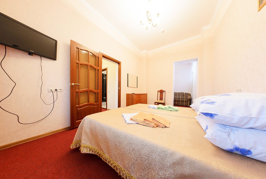 Номер для троих гостей оснащен дополнительным спальным местом диваном-кроватью. Имеется выход на балкон.