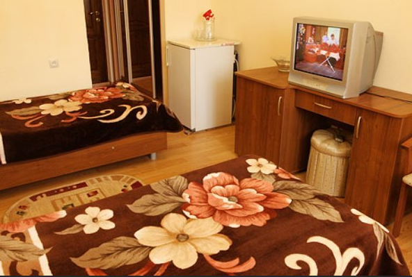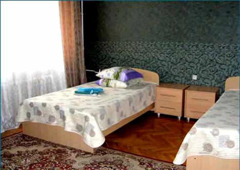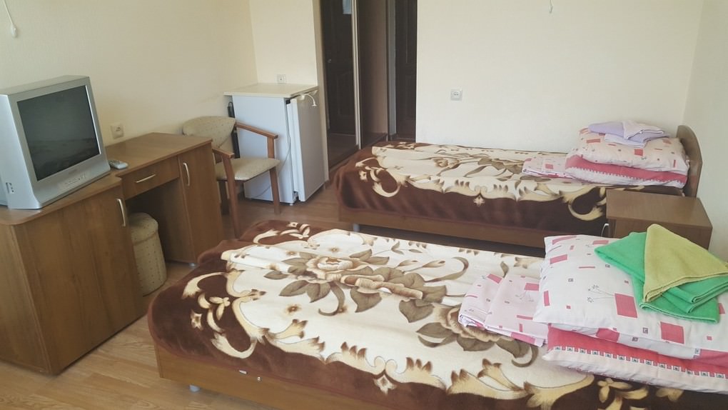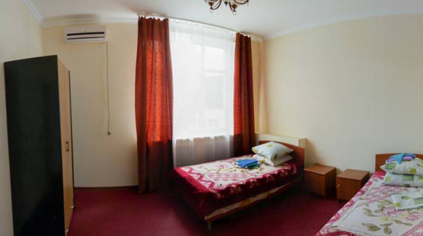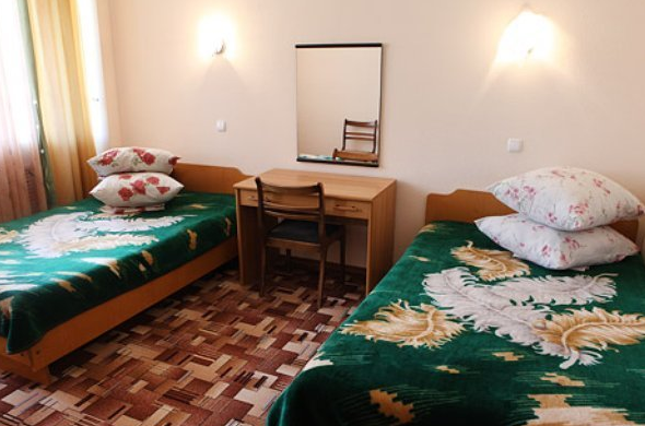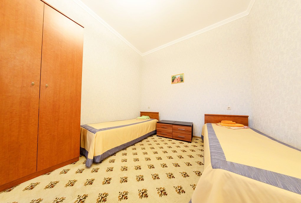 Номер меблирован 2 односпальными кроватями, столом, стульями, шкафом и тумбами.